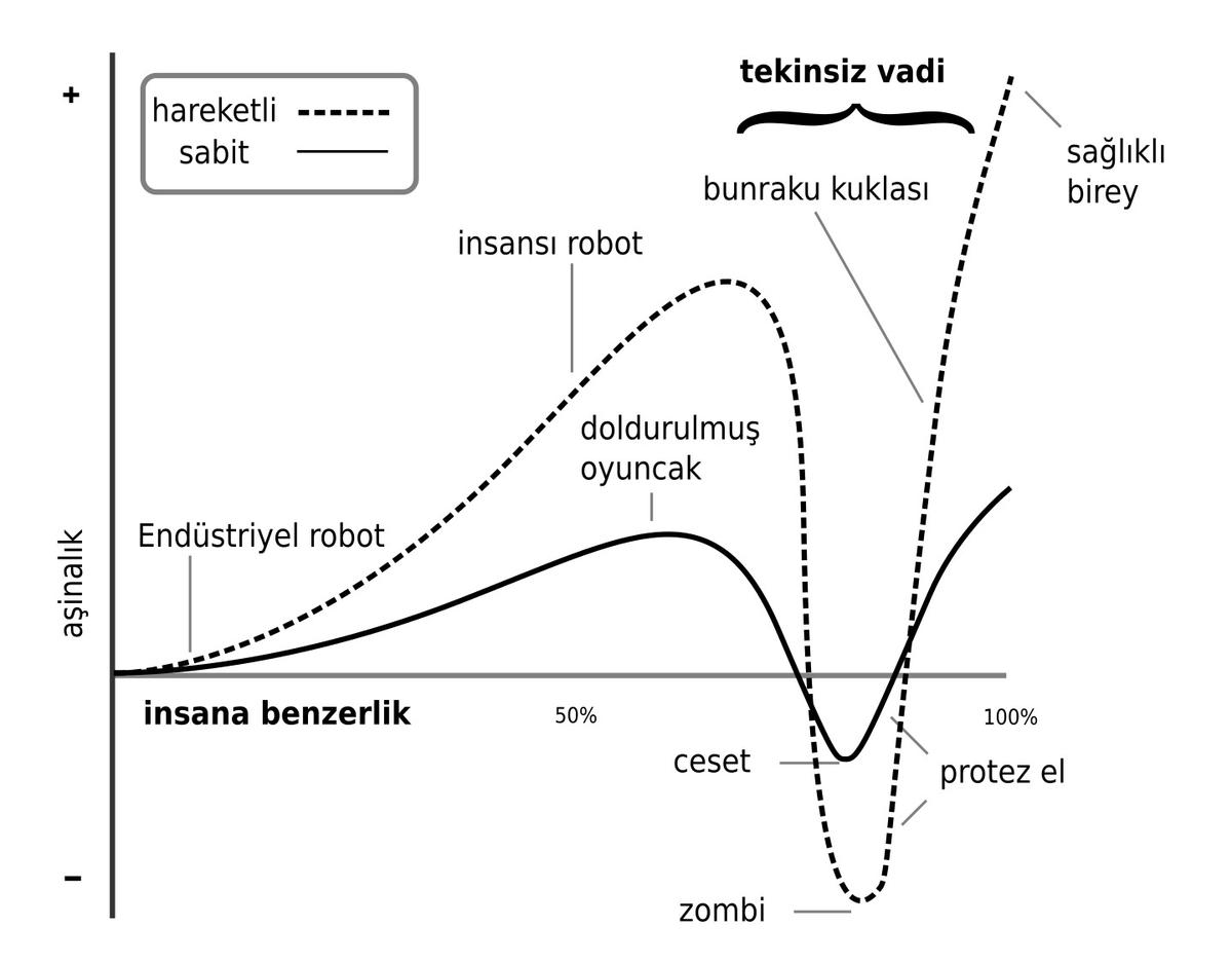 Robotik profesörü Masahiro Mori tarafından 1970 yılında ortaya koyulan Tekinsiz Vadi Teorisi, bir nesnenin insana olan benzerliğinin derecesi ile o nesneye verilen duygusal tepki arasındaki ilişkiyi ifade eder. Teoriye göre bir nesnenin insana benzerliği arttıkça insanların nesneye karşı beslediği pozitif duygular da belirli bir düzeye kadar artış gösterir ancak nesne, görünüş bakımından gerçek bir insandan ayırt edilemeyecek hale geldiği noktada olumlu duygular yerini korku ve tiksinme gibi duygulara bırakır. Mori'nin teorinin daha iyi anlaşılması için çizdiği grafikte, insana benzerliğin en fazla olduğu haldeki duygu durumunu gösteren bölgede derin bir çukur görülür. Teori, ismini grafikte oluşan bu çukur görünümünden alır.
