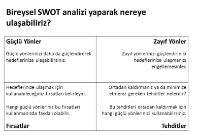 Bu analiz, kişinin hem içsel (güçlü/zayıf yönler) hem de dışsal (fırsatlar/tehditler) faktörleri objektif olarak değerlendirmesini sağlar.