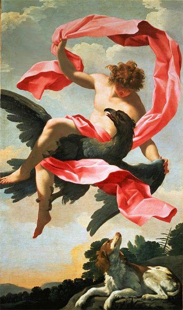 Efsâneye göre, Zeus Ganymedes adında güzel bir ölümlü genci gördü ve ona aşık oldu. Ganymedes, Zeus tarafından Frigya'daki Truva yakınlarındaki İda Dağı'ndan kaçırıldı. Ganymedes, ayrıcalıklı statüsü ortaya çıkmadan önce bir kahramanın çocukluğunun karakteristik özelliği olan sade veya mütevazı bir uğraş olan koyun gütmekteydi, bir kartal genci Olimpos Dağı'na götürdüğünde. Kuş bazen Zeus'un emrinde olarak, bazen de bizzat Zeus olarak tanımlanıyor ama çoğu varyantta bu kartalın Zeus olarak anlatılmasıyla, tablolarda bu ikiliyi genelde kartalın Ganymedes'i kaçırdığı zamanın çizilmesiyle görürüz.