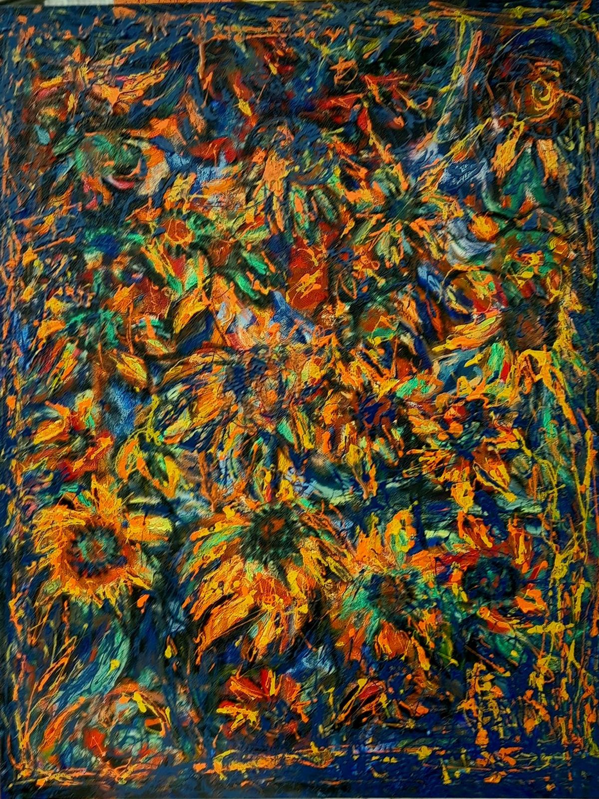 The first painting is a floral abstraction work. When I looked at this work, I was happy to be able to visualize something in my head, that is, to understand that it was a work on a flower. The yellow, blue, and green tones used create a harmony with each other. I can say that I liked this painting more because it reminded me of Van Gogh's Sunflowers. I can say that it immerses me in dreams and when I imagine myself getting lost among these flowers, I can say that it covers me with happiness. I can say that she should continue this kind of work and that she is successful in flower abstraction.