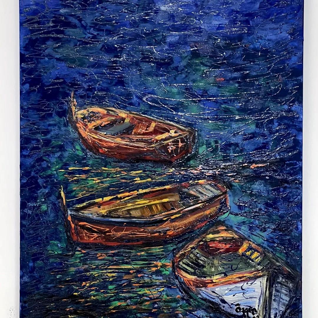 The second painting, also an abstraction of the beach, was the second work that I liked in terms of visualizing something in my head and looking more realistic. The beach is one of the places that give people peace and happiness. It has been a painting that is good for my soul, even nourishes it and fills me with peace. The colors used are again in accordance with the main theme and the colors that reveal what is wanted to tell are preferred. I also liked the white lines he threw in between. And especially the wave image is among the details I like. I can say that I like the work with all its lines.