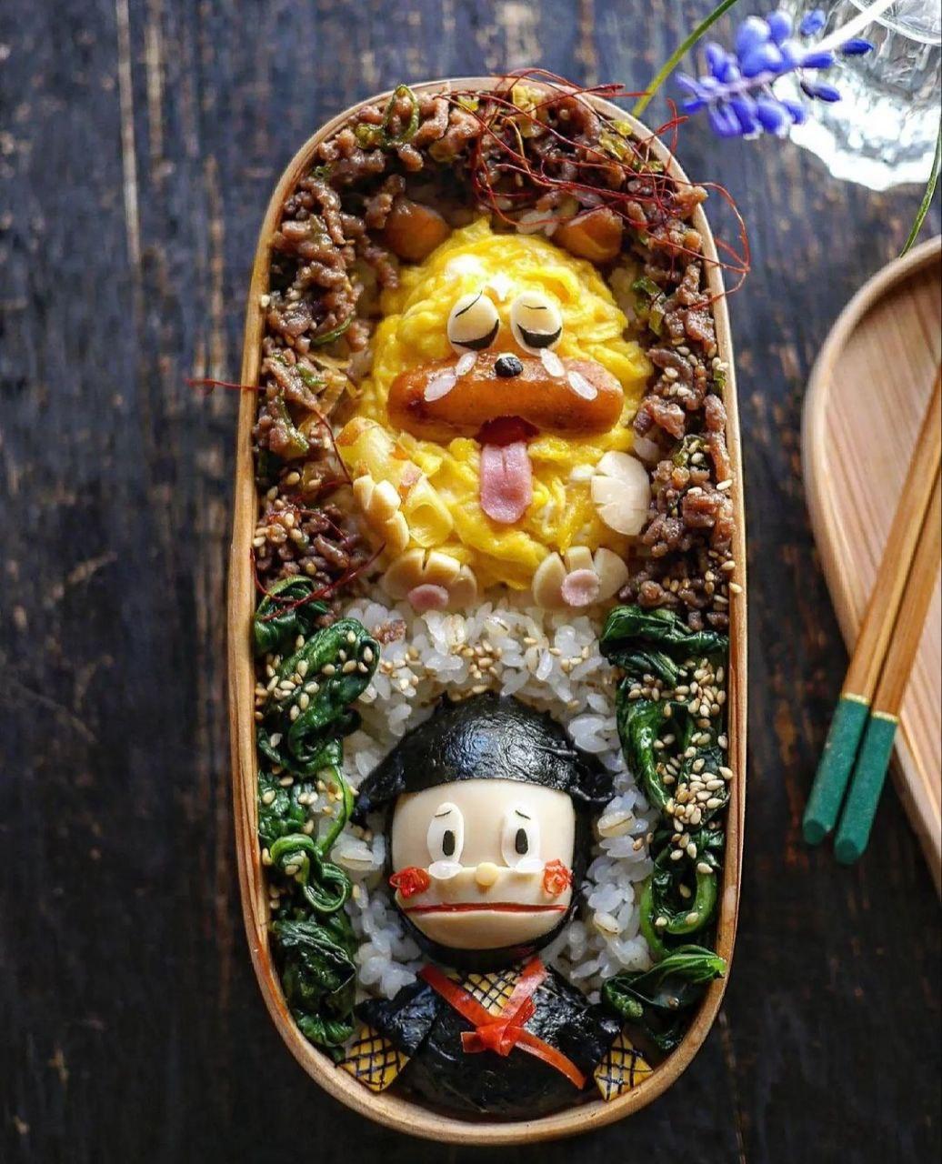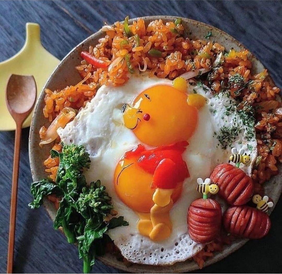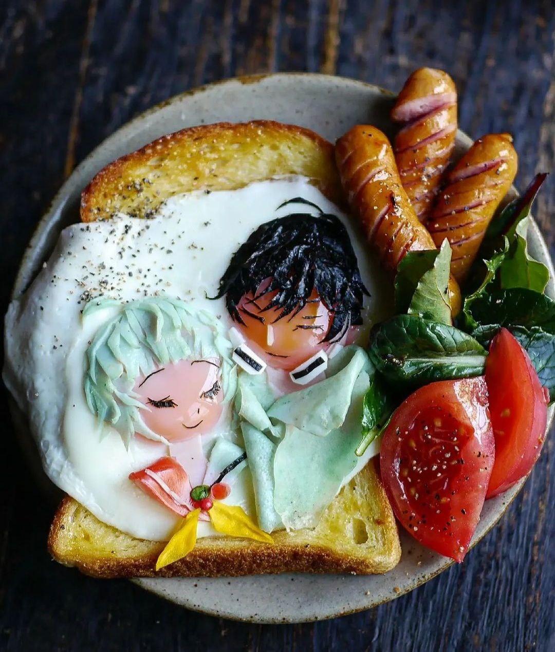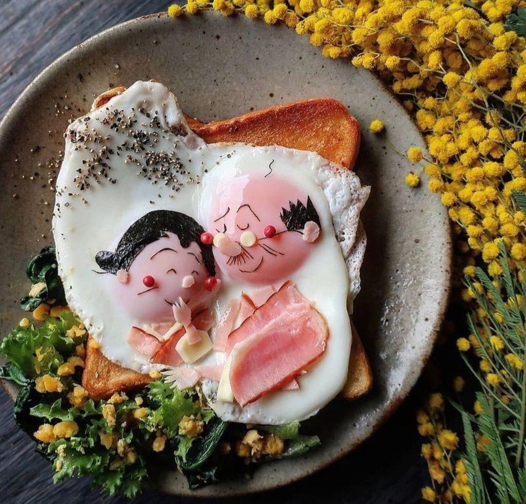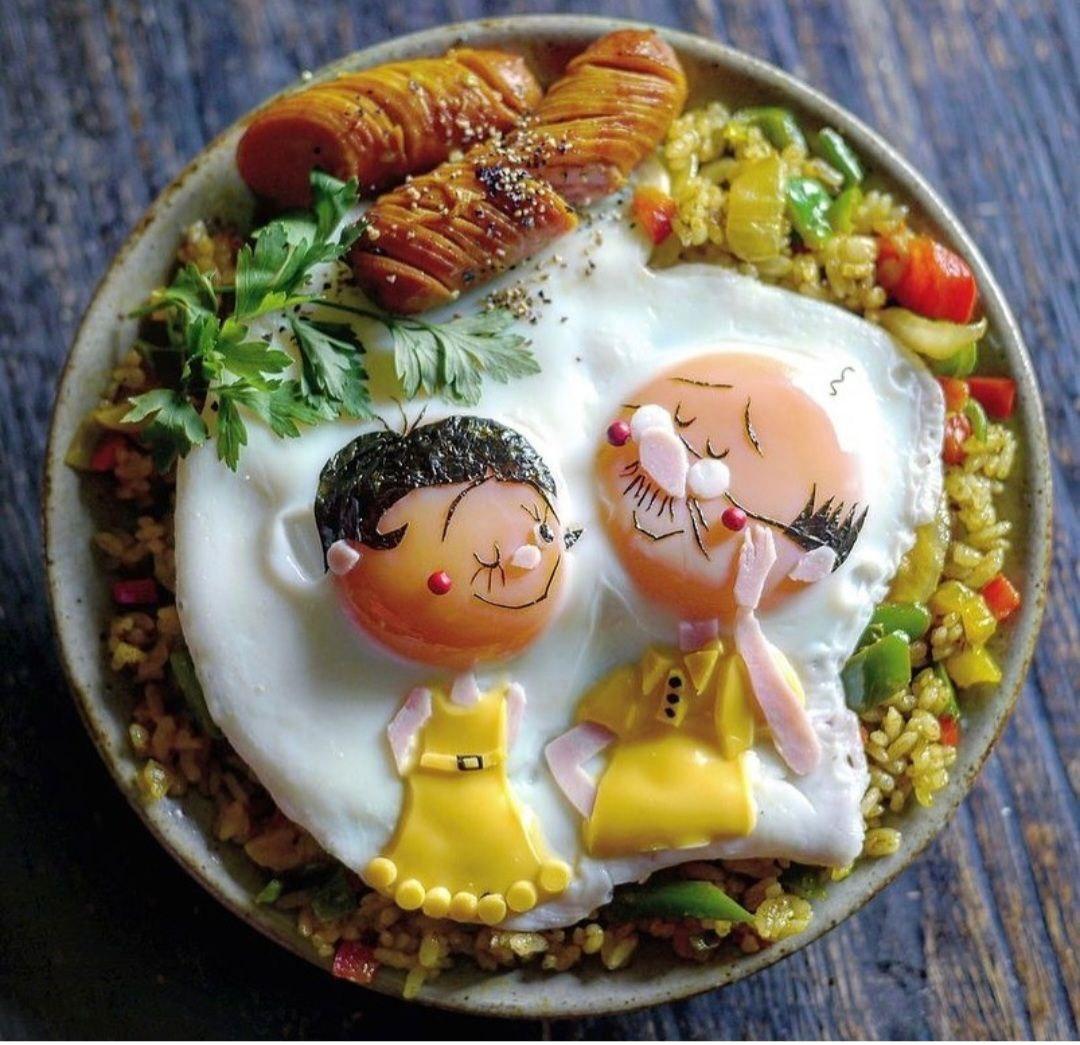 Sebzelerin ve meyvelerin elbise gibi giydirildiği, bir masanın üzerinde adeta bir sahne kurulduğu bu sanat eserleri, yemek masasını bir film sahnesine dönüştürür. Yumurtadan yapılan sevimli bir karakter yaratıcılığın ve emeğin harmanlandığı bir sanat şölenidir.