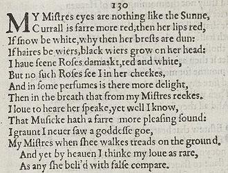 In the first lines, he talks as if he is deploring the existence of the dark lady. The speaker gives a response to the conventional idea of how a lady should be. The descriptions tell us that she is ugly according to the speaker, but then he adds the volta: not ugly, just a normal person; there is beauty in her appearance. She is rare. He is playing with Petrarchan conventions and standards of beauty. He says my lady is not like the other lady in poems, but that does not make her ugly. She is not a goddess but beautiful. Callaghansays this poem is in the anti-petracan tradition.