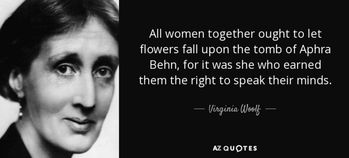 To conclude, the works of Aphra Behn are universal since she touched upon various problems ranging from colonialism to slavery. Behn was able to gain a literary career even though she was born during a problematic time of the English Civil War that followed a more problematic time by the reign of King Charles II who neglected his country. During her time, she was one of the leading playwrights and The Rover was a courtly play that was staged multiple times. Yet, she struggled with ill health and debt in her last years and died in poverty in 1689. She is an interesting revolutionary female author from the Restoration period who defended women's rights and women's power while criticizing male-dominated societies with her mesmerizing and courageous works as well as the libertine side that she both adopted and criticized. Aphra Behn was forgotten for a long time until Virginia Woolf rediscovered her in the 20th century. Woolf wrote a passage about Behn as a tribute to her in the 1929 essay ‘’A Room of One’s Own’’. “All women together ought to let flowers fall upon the tomb of Aphra Behn, for it was she who earned them the right to speak their minds.” (Woolf). Thanks to Virginia Woolf’s rediscovery of Behn, she once again found herself a rightful place in English literary history.