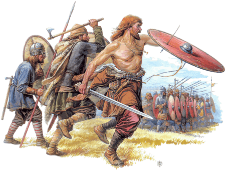 Not less terrifying was the appearance and rapid movement of the naked warriors in the van, which indicated men in the prime of their strength and beauty: while all the warriors in the front ranks were richly adorned with gold necklaces and bracelets. (Polybius)