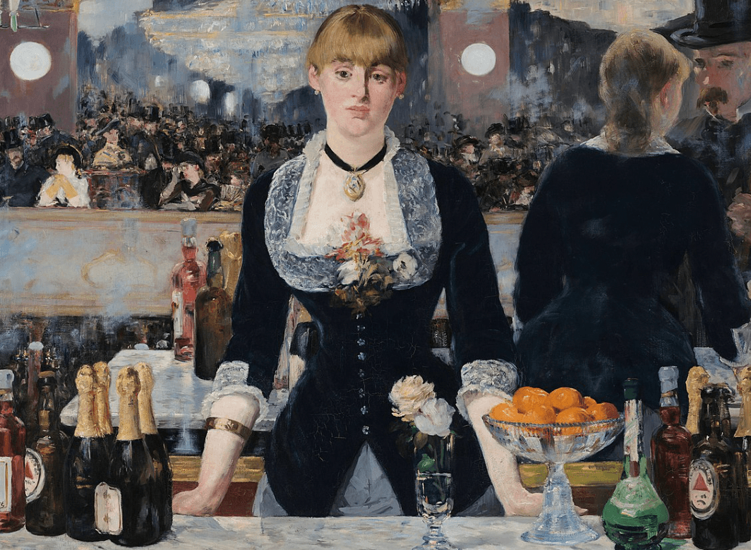 Impressionist artists also depicted public leisure scenes, scenes from cafes and cabarets in their paintings. To exemplify, Edouard Manet depicted his impressions of a scene from a bar in his last work named A Bar at the Folies-Bergère. The painting is inspired by his own experience by representing the leisure time of the growing middle class. In this composition, while he uses vivid colors in the front of the painting, in the background the colors become paler. The painting also remains ambiguous due to some aspects; it is not clear if the bar is indoor or outdoor, and the bartender's position is also ambiguous as her reflection shows her talking to a customer while she is also looking directly at the viewer. Thus, the mirror on the background is misleading. Since impressionists mostly depicted outdoor scenes, Manet intended to represent an outdoor scene. Yet, the chandeliers are puzzling for the viewer as well as they look as if they are attached to the ceiling while the scene reflects a background setting.