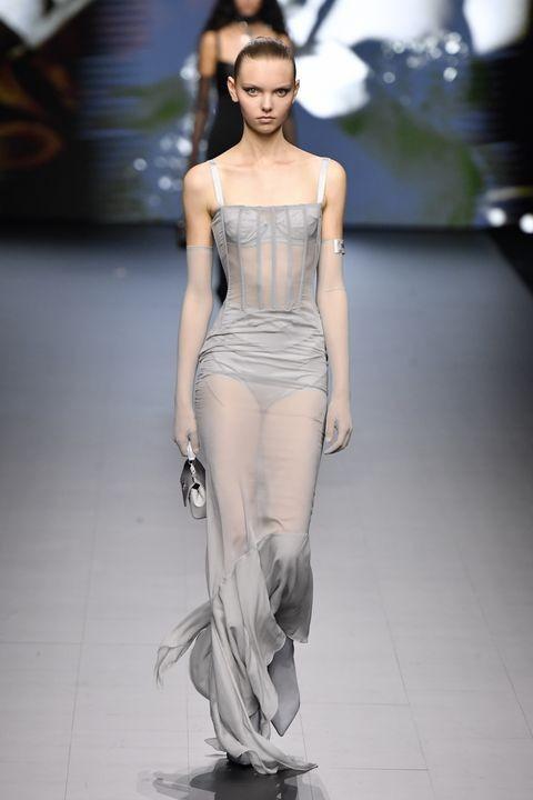 Transparan kıyafetler markaların 2023 bahar/yaz koleksiyonlarda oldukça büyük bir yer kapladı. Özellikle transparan elbiseler ile gördüğümüz bu kumaşı t-shirtlerde de görmek mümkün. Topuklu ayakkabılar ve küçük el çantaları ile kombinleyerek oldukça şık bir görünüm elde edebilirsiniz.
