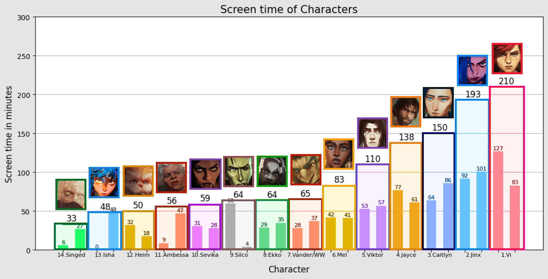 Bu kadar övgünün yanı sıra, Arcane'nin ikinci sezonda Vi'a büyük haksızlık yaptığını düşünüyorum, hatta dizinin yapımcısı da bunu bir nevi itiraf etmiş.* İkinci sezonda Vi'ya olan ilgilerini kaybettiklerini itiraf etmiş. İlk sezonda en fazla ekran süresi olan Vi, ikinci sezonda en düşük ekran süresine sahip olanlardan biri.* İlk sezonda Vi'yın birçok halini görmüştük. Önce çocukken, o kararlı ve liderlik hali yanı sıra üstündeki baskıyla aldığı kararlar ve yaptığı hatalarla geçmişini anlamıştık. Sonra, 7 sene boyunca kaldığı hapishane hayatı dolayısıyla dönüştüğü kişiyi, pişmanlığını; Caitlyn ile tanışmasıyla ve ona açılmasıyla çıkan yeni bir yanını; Sevika ve Silco ile olan sahnelerde korumacı tavrı ve içindeki nefretiyle birlikte Jinx'e olan sevgisini ve fedakar, hatta bir bakıma umutlu tarafını görmüştük. Vi'ın ilk sezon gerçekten üstüne düşünülmüş bir karakter olduğu belli oluyordu. Hikayesini, hislerini, davranışlarını anlayabiliyorduk.
