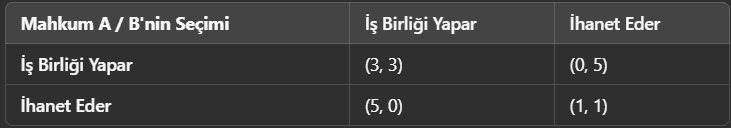 - Ödül-Ceza Sistemi (Kazanç Matrisi): Her oyuncunun seçimine bağlı olarak kazanacağı veya kaybedeceği ödül veya ceza.