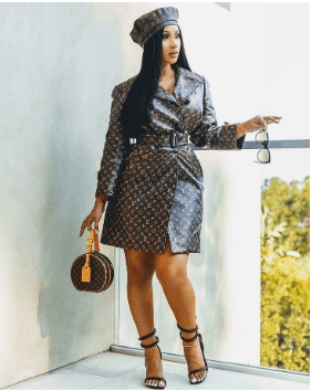 Cardi B wearing a full of Louis Vuitton monogram jacket.