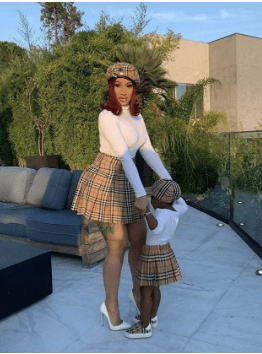 Cardi B and her daughter Kulture wearing matching Burberry skirts and caps.