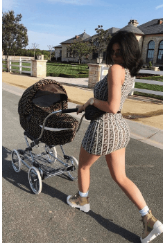 Kylie Jenner wearing a full monogram Fendi dress.