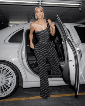 K_im Kardashian wearing a full monogram of Balenciaga jumpsuit._
