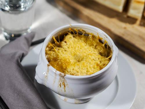 It is a soup that is made from an onion. Sometimes waiters serve the soup with cheese bread.