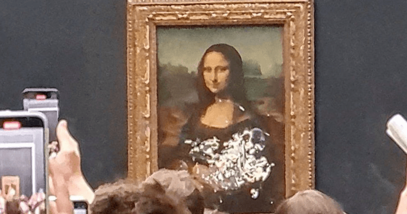 Yaşlı bir kadın kılığına girmiş tekerlekli sandalyede bir adam, Paris'teki Louvre Müzesi'ndeki Leonardo da Vinci'nin ünlü tablosu Mona Lisa'ya pasta fırlattı.