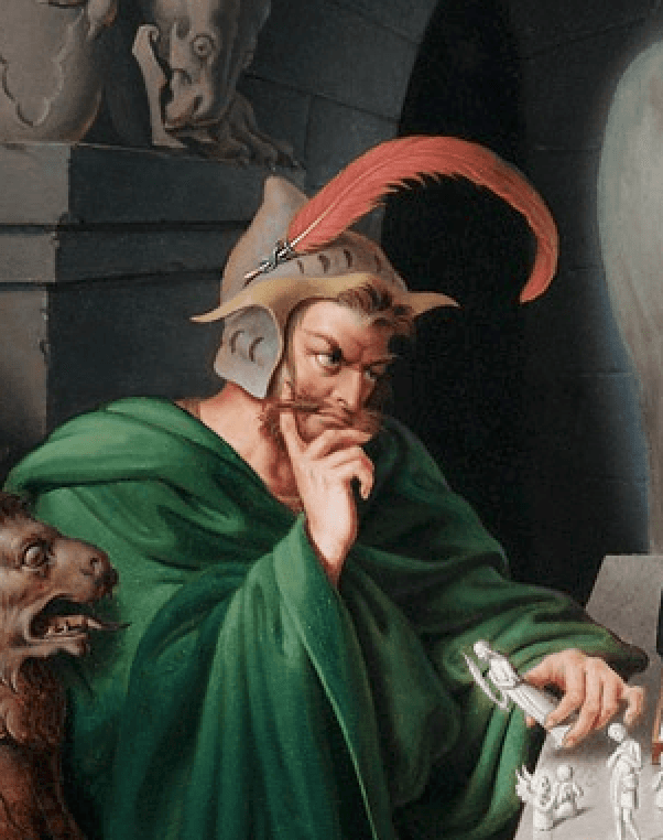 Sol tarafta oturan Şeytan, insanın tam tersine bir tavır içinde. Geriye yaslanmış, rahat ve kendinden emin; bedeniyle bile üstünlüğünü ilan ediyor. Tahtaya bakma gereği duymuyor çünkü oyunu çoktan kazandığına inanıyor. Üzerindeki koyu yeşil pelerin ve kırmızı tüy detaylı şapka, kötülüğün bilinen sembollerini taşıyor. Ancak Retzsch’in amacı yalnızca “kötüyü” göstermek değil; kibrin insanı nasıl körleştirdiğini anlatmak. Şeytan burada kazanmak için strateji kuran bir oyuncu değil, kendi zaferine inancından beslenen bir varlık. Bu kör güven, onu oyunun hâlâ sürdüğünü, karşısındaki insanın hala bir umut aradığını fark edemeyecek kadar içine kapatıyor.