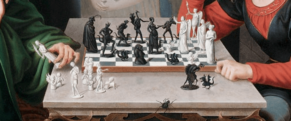 Retzsch’in ayrıntılara gösterdiği özen, satranç taşlarının dizilişinde de kendini belli ediyor. Siyah taşlar saldırıya geçmiş, beyazlar savunmada. Ancak dikkatle bakarsanız fark edeceksiniz ki oyun henüz bitmemiş. Beyaz taraf hala bir çıkış yolu arıyor ve bir umut taşıyor.