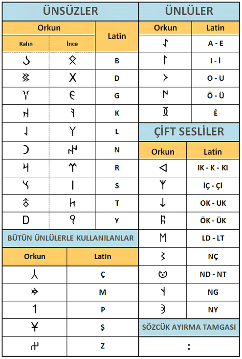 Tarih sahnesinde görülen ilk Türk topluğu Sakalar olsa da biz tarihte ilk alfabeyi Göktürkler'de görürüz. İlk kurulan Türk devleti olan Göktürkler kendi alfabesini oluşturmuş, yarı göçebe yaşamı benimseyen Orta Asya'da yaşayan bir devletti. İslamiyet öncesinde en geniş sınırlara ulaşan devlet bize yazılı eserler bıraktı. Orhun Abideleri veya Göktürk Yazıtları dediğimiz 3 taştan oluşan bu yazıtlar bir yüzü Çin Alfabesiyle diğer yüzü Göktürk Alfabesiyle yazılmıştır. Bir söylev niteliğinde olan bu yazıtlarda hem tarihi kahramanlıklar hem de devlet hakkında öğütler bulabilmek mümkündür. Bu alfabe şuan kullandığımız alfabeden oldukça farklıydı. 38 harften oluşurdu. 4'ü ünlü, 31'ünnsüz ve 3'ü çift ünsüzdü. Bu 4 ünlü harf 8 sesi temsil eder. Formal olarak da oldukça bizden farklı olan alfabe çapraz ve dik çizgilerden oluşur.