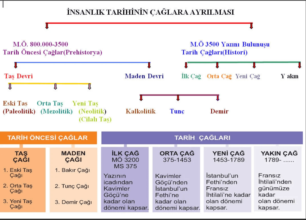 İnsanlık tarihi, Paleolitik Çağ'dan yani Eski Taş Devri başlayıp, ardından Neolitik Çağ'ın diğer bir ismiyle Cilalı Taş Devri tarafından takip edilen tarih öncesine dayanıyordu.
