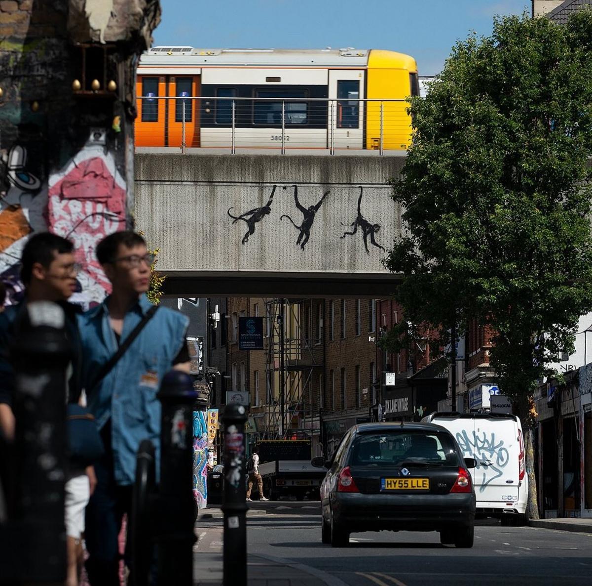 Doğu Londra’daki Brick Lane’de bir demiryolu köprüsü üzerinde sallanan üç maymun belirdi. Maymun figürleri, şehrin işlek caddelerinden biri olan Brick Lane’de yoldan geçenlerin de ilgi odağı oldu.