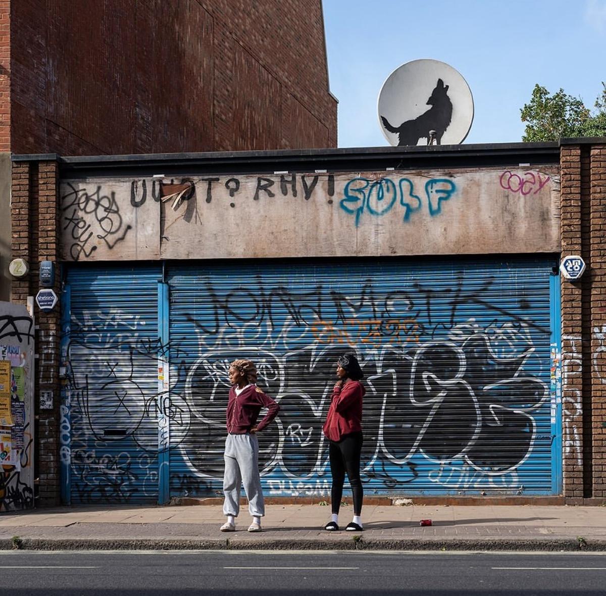 Londra'nın güneyindeki Peckham, Rye Lane'de bir uydu anteninin üzerine çizilmiş kurt silüetini paylaştı. Bu eser kısa bir süre içinde maskeleri kişiler tarafından çalındı.