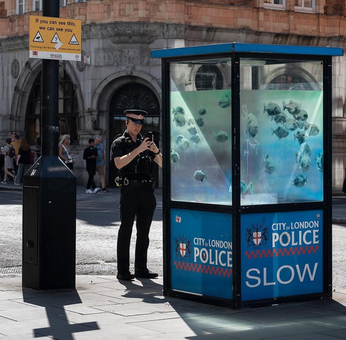 Old Bailey ve St Paul Katedrali yakınlarındaki Ludgate Hill’de bulunan cam cepheli kutunun, bir akvaryum görünümünü almasını sağlayan sanatçı, kulübe camlarının üstüne piranalar çizdi.