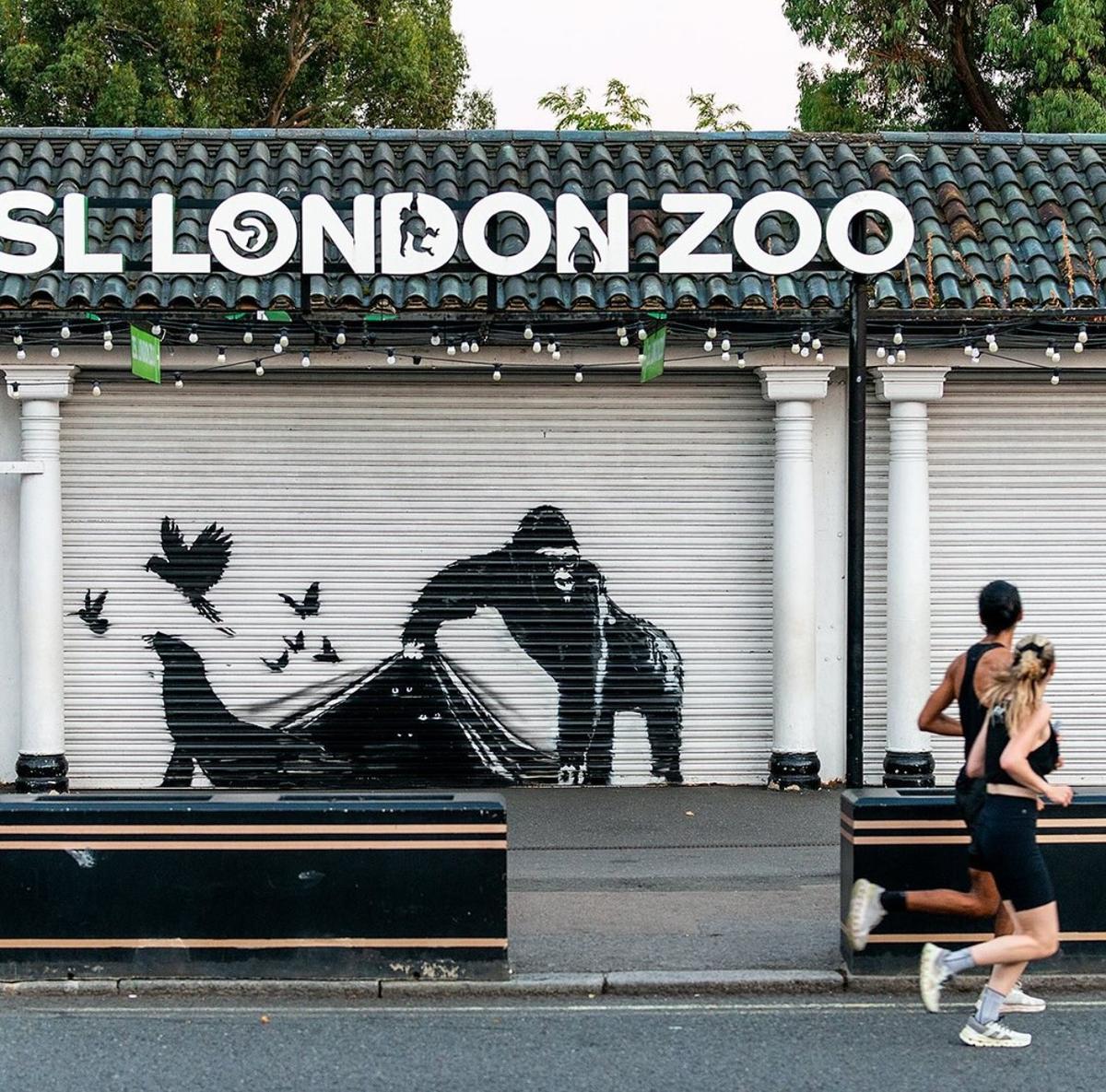 Son duvar resminde bir goril, Londra Hayvanat Bahçesi’nin kepengini kaldırarak bir deniz aslanı ve birkaç kuşu serbest bırakıyor, diğer hayvanlar ise içeriden onları gözlüyor.