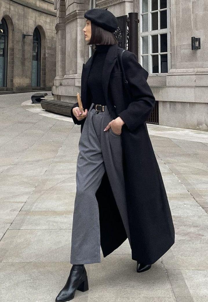 İkinci kombinimiz kışın vazgeçilmez renklerinden siyah. Siyah kaban, gri kumaş pantolon, deri bot ve kullanılan aksesuarlarla birlikte ortaya hoş bir stil çıkmış.
