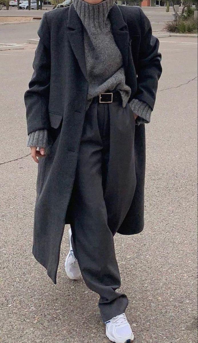 Üçüncü kombinimiz kaban rengi ise gri. Gri kazak, pantolon, kemer ve beyaz spor ayakkabı ile kombinlenen bu kombin hem rahat hem de uyumlu gözüküyor.