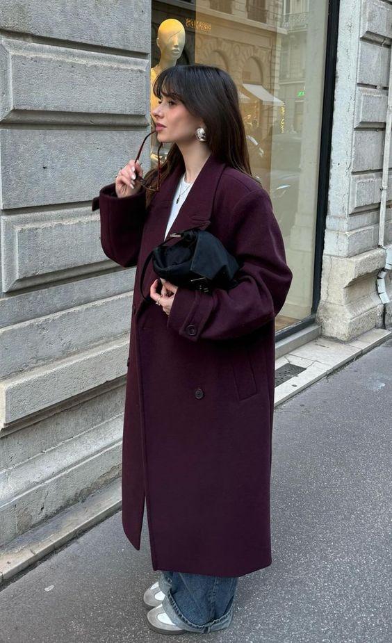 Beşinci kombinimiz kaban rengi bordo. Bordo benimde kıyafetlerde en sevdiğim renklerden biri. Bu kombinde kot pantolon ve küçük siyah çanta ve gri, beyaz spor ayakkabı ile geçiş sağlanılmış ve göze hitap eden uyum oluşturulmuş.