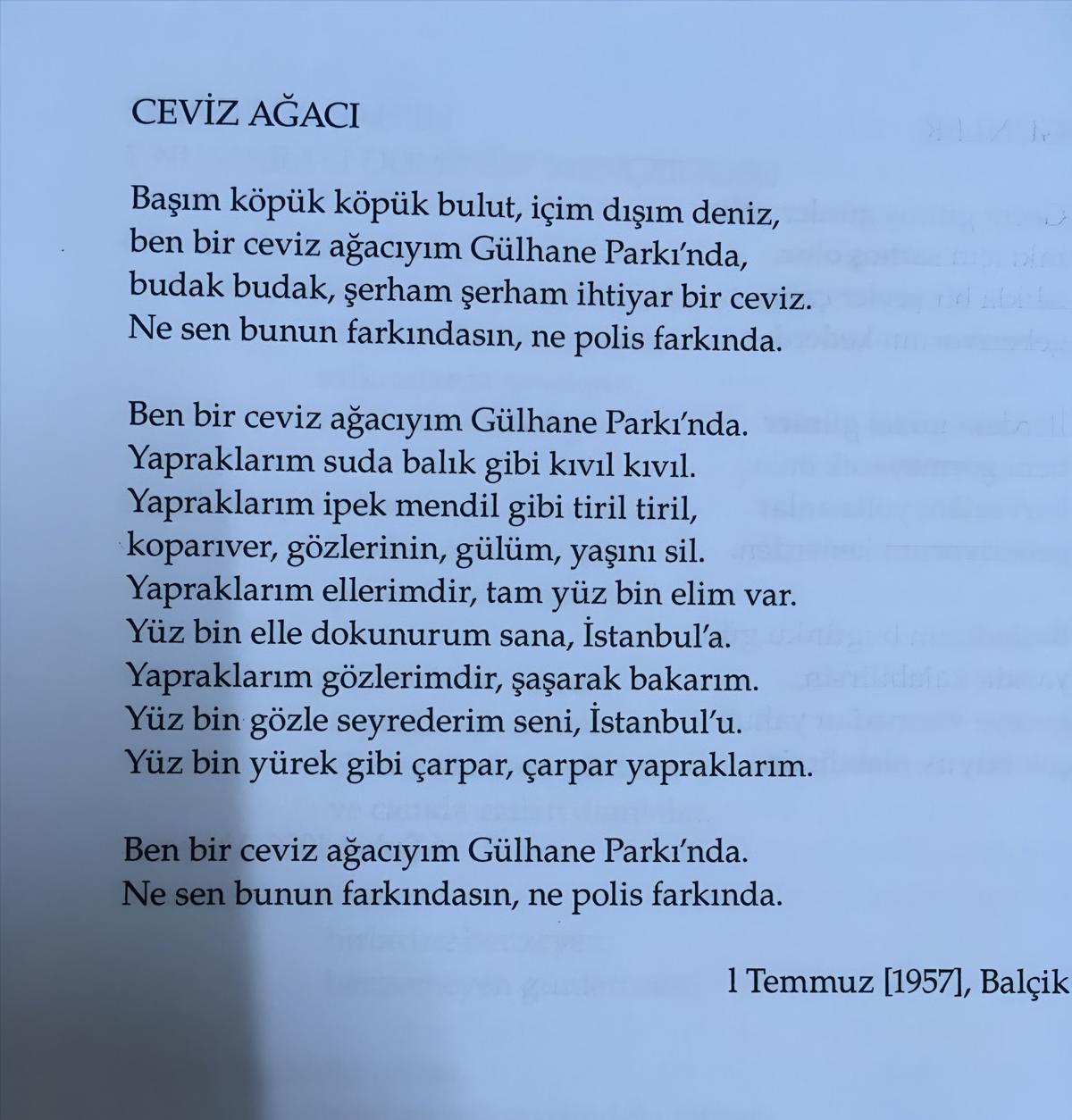 “Başım köpük köpük bulut, içim dışım deniz, ben bir ceviz ağacıyım Gülhane Parkı’nda…”