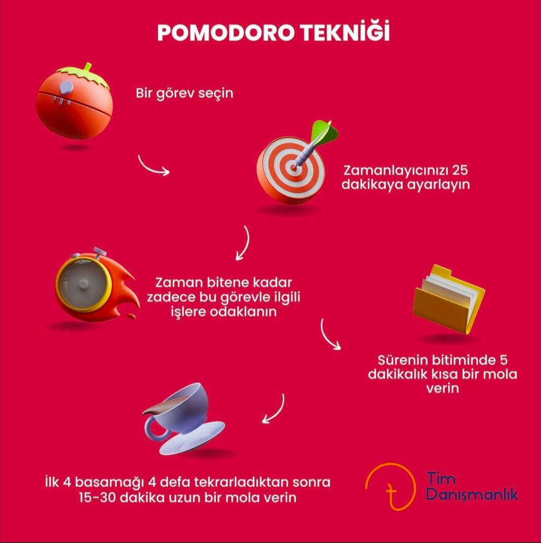- PAMODORA TEKNİĞİ: Bu teknikte kendimize bir saat veya 2 saat çalışma rütini belirliyoruz ve 10 dk çalışıyoruz beş dk ara veriyoruz. Her 10 dk çalışma arkasından 5 dk mola vererek toplamda 5 sefer mola ve 10dk çalışma şeklinde 6 defada çalışıyoruz.