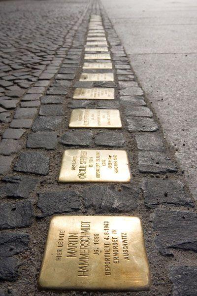 Almanya’da Nazi rejimi tarafından öldürülen insanların anısına kaldırımlara yerleştirilen küçük pirinç plakalar. Her biri bir kurbanın adı, doğum tarihi ve ölüm yeriyle kişiselleştirilmiştir. Göz hizasında değil, ayak altında yer alır; tesadüfen fark edilir. Bu yönüyle hem gündelik yaşamın içine sızar hem de “unutuş”un tam ortasında bir hafıza alanı yaratır.