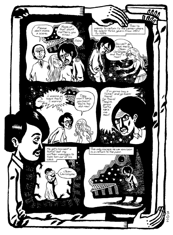 Let's take a closer look at a couple of pages for a better understanding of its unique style. On page 302, we can see the frame of the page is the narrator's brother.