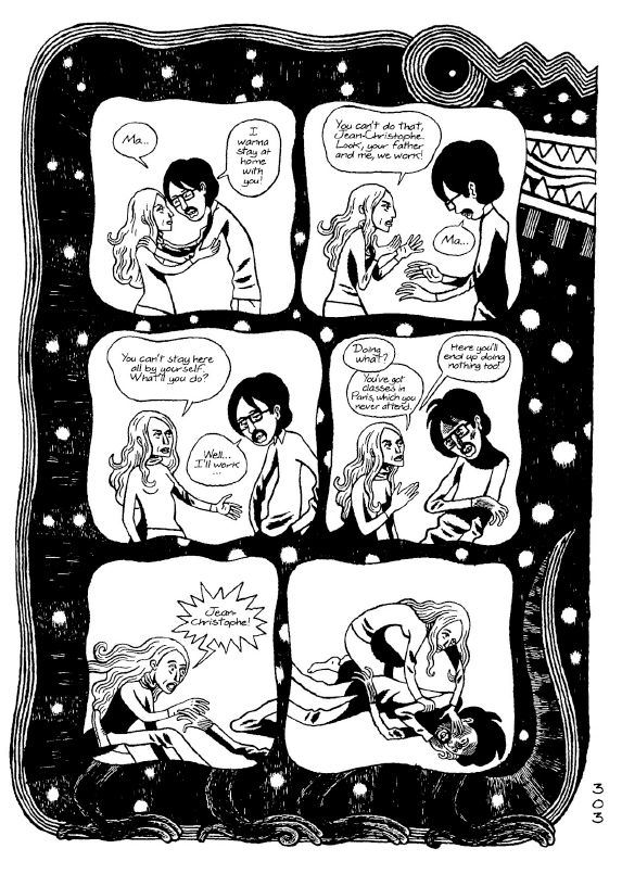 This distinct framing technique helps centralize his brother and it immediately takes the attention of the reader. It creates the feeling of being overwhelmed and stuck. Moreover, by telling the story in this frame, the narrator creates the idea that these are Jean Christophe's thoughts and emotions. In the scenes, we can see a mythical-looking creature is always in the background. It stands for the High Evil or epilepsy. It can be seen throughout the comic when the character's sickness gets worse or when the characters decide to do unethical things. We can see that Jean Christophe gets surrounded by its frame by frame and is left all alone. Jean somewhat becomes possessed by this evil.