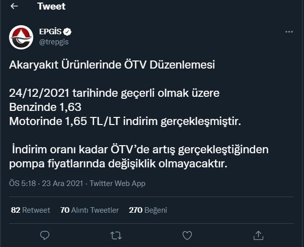 Enerji Petrol Gaz İkmal İstasyonları'nın Twitter hesabından yapılan açıklamada, "24/12/2021 tarihinde geçerli olmak üzere benzinde 1,63 Motorinde 1,65 TL/LT indirim gerçekleşmiştir. İndirim oranı kadar ÖTV’de artış gerçekleştiğinden pompa fiyatlarında değişiklik olmayacaktır" ifadeleri kullanıldı.