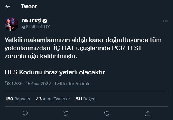 Ekşi paylaşımında, "Yetkili makamlarımızın aldığı karar doğrultusunda tüm yolcularımızdan İÇ HAT uçuşlarında PCR TEST zorunluluğu kaldırılmıştır" ifadelerini kullandı.