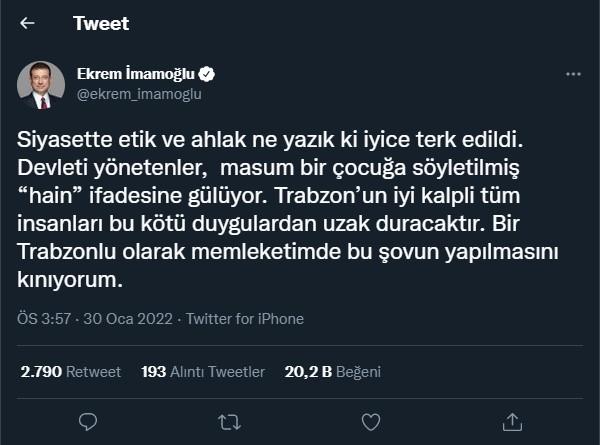 İstanbul Büyükşehir Belediyesi Ekrem İmamoğlu da sosyal medya hesabında yaşananlarla ilgili "Siyasette etik ve ahlak ne yazık ki iyice terk edildi" yorumunu yaptı.