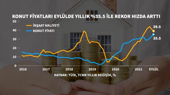 Konut fiyatları Eylül'de geçen yılın aynı dönemine göre yüzde 35,51 artışla endeks tarihinin en yüksek yıllık artışını kaydetti.