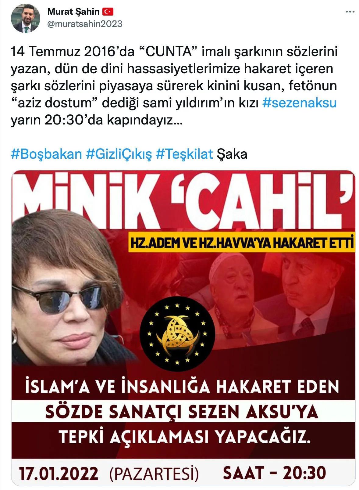 Ünlü şarkıcı Sezen Aksu'nun 2017 yılında çıkardığı 'Şahane Bir Şey Yaşamak' şarkısında geçen "Binmişiz bir alamete. Gidiyoruz kıyamete. Selam söyleyin o cahil Havva ile Adem'e..." sözleri tepkilerin hedefi olmuştu. Milli Beka Hareketi Genel Başkanı Murat Şahin ise Sezen Aksu'nun evinin önünde bu akşam eylem yapacaklarını "20:30’da kapındayız" diye duyurdu.