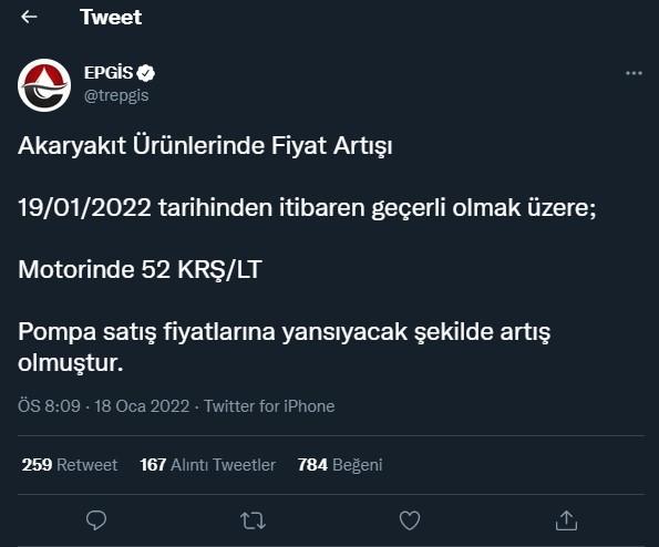 Açıklamada "Akaryakıt Ürünlerinde Fiyat Artışı 19/01/2022 tarihinden itibaren geçerli olmak üzere; Motorinde 52 KRŞ/LT Pompa satış fiyatlarına yansıyacak şekilde artış olmuştur" denildi.