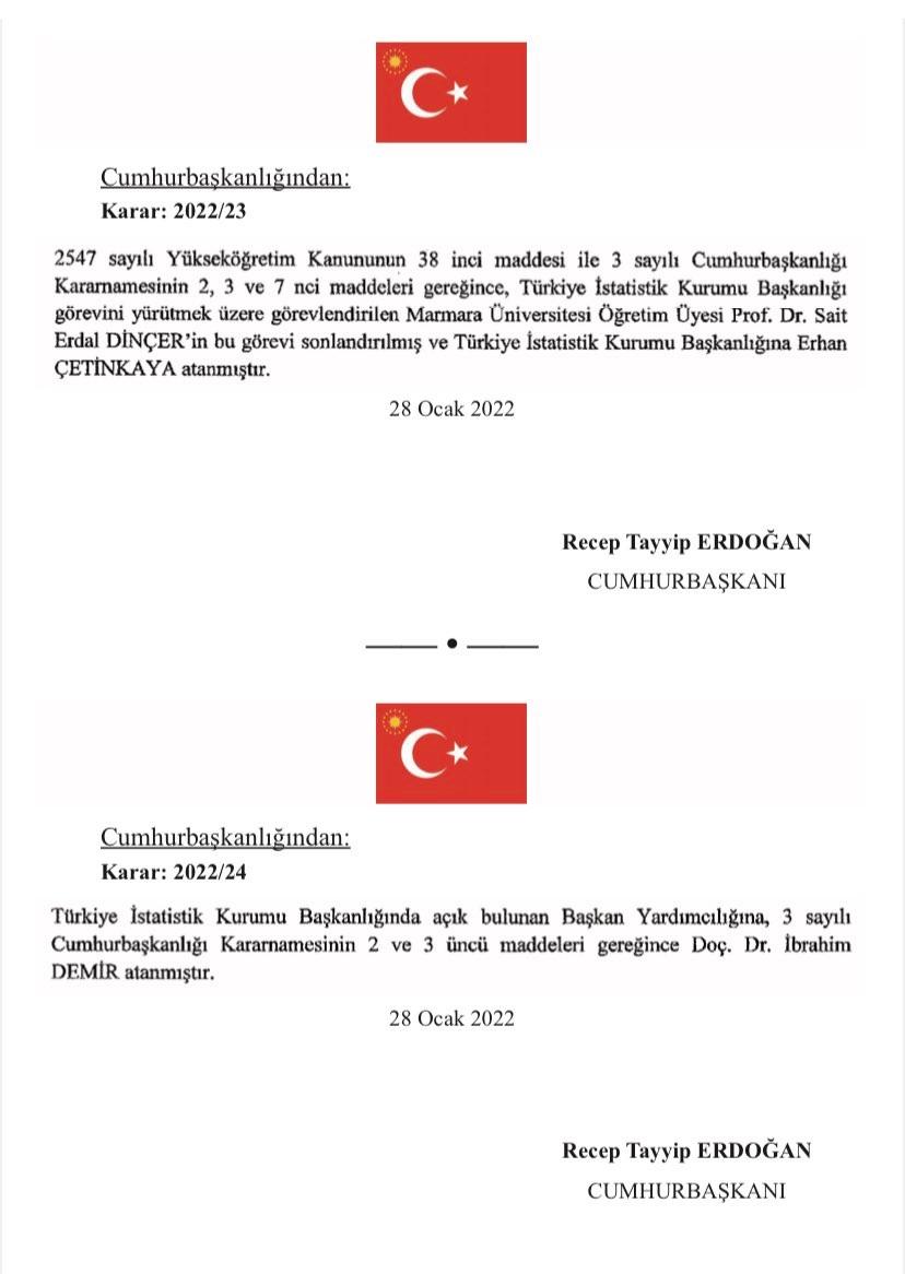 Resmi Gazete'de yayınlanan Cumhurbaşkanı kararı ile TÜİK Başkanı Sait Erdal Dinçer görevden alınarak, yerine Erhan Çetinkaya atandı.