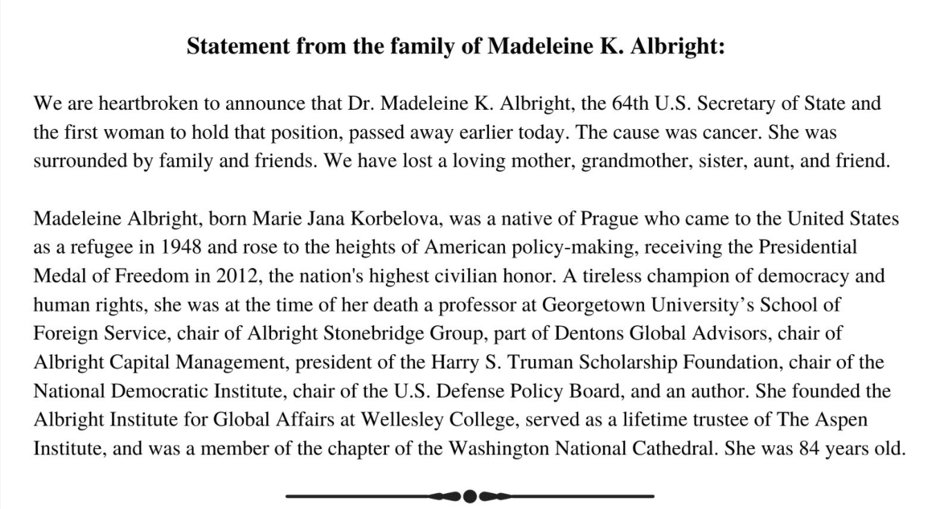 Yakalandığı kansere 84 yaşında yenik düşen Albright'ın uluslararası ilişkilere pek çok etkisi olmuştu. Prag'ta doğan Albright, diplomat babasının Nazi ve komünist rejimden dolayı ABD'ye göçmesi ile buradaki hayatına başlamıştı.