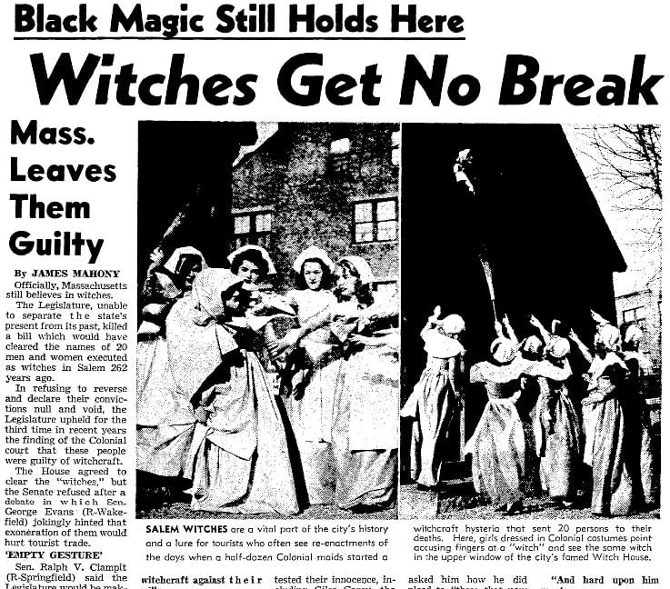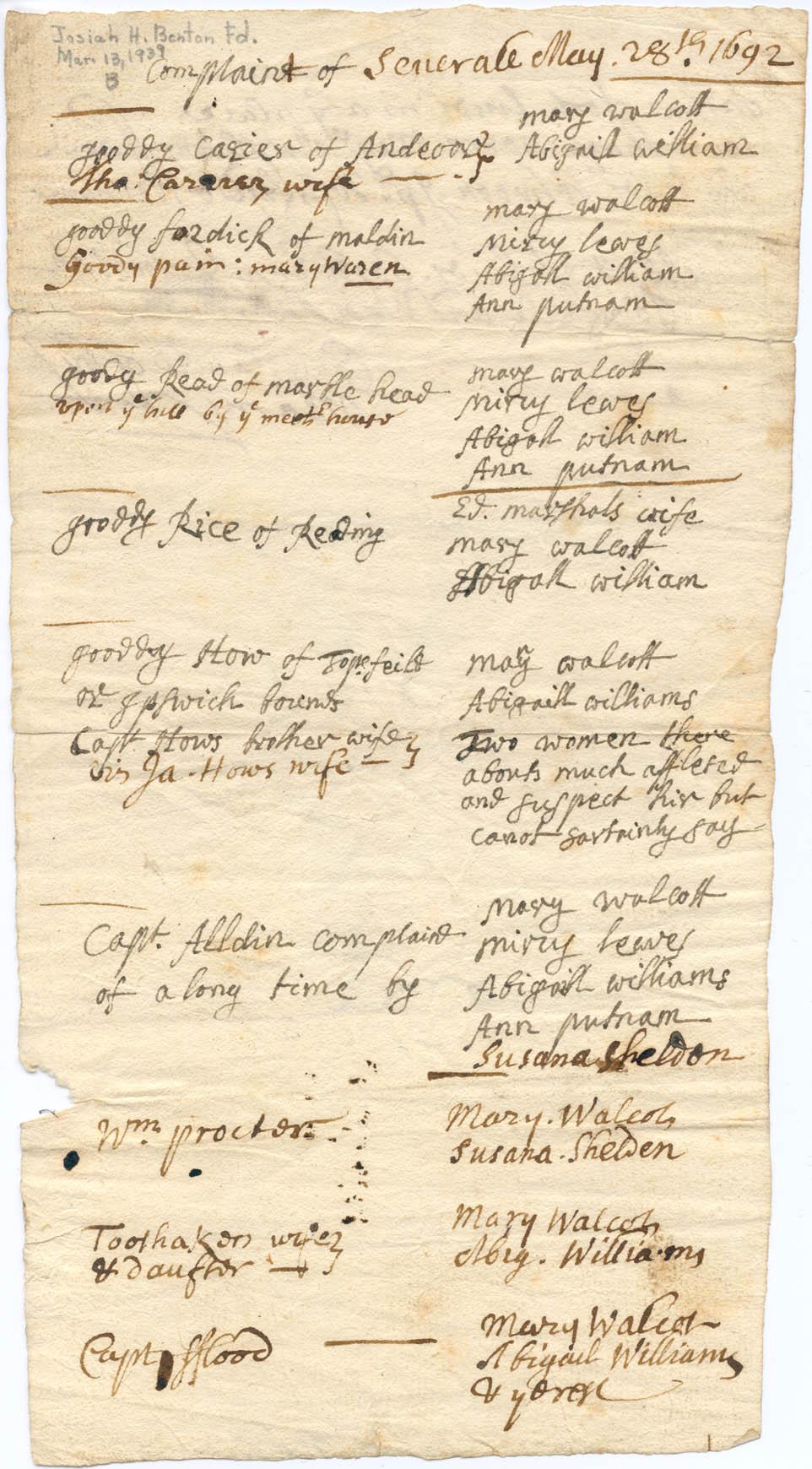 Şimdiki durağımız ise Massachusetts. 1692 yılının şubat ayında, Salem kentinde bir cadılık vakası kendini gösterdi. Kayıtlara göre, birbirleriyle akrabalık ilişkileri olan 9 yaşındaki Elizabeth ve 11 yaşındaki bir diğer kız çocuğu Abigail garip davranışlar sergilemekteydi. Bu anormal davranışlar, kendini yerlerde sürükleme ve gerekmeksiz çığlık atmalarıydı. Kendileri o dönemin koşullarına uygun bir muayeneden geçmiş ve hiçbir sağlık problemi ile karşılaşılmamıştı. O dönemde Avrupa'da kendini göstermiş olan cadılık furyası buralarda da duyulmuştu. Bunun üzerine kenttekiler bu iki küçük kızın cadı olabileceği iddiası ile mahkemeler kurmuştu. Kim bilir belki de bunun nedeni Elizabeth'in babası olan Papaz Samuel Parris'in kötü bir namı olmasıdır. Belki de Tanrı'nın onu kızlarıyla cezalandırıyor olabileceği düşüncesidir. Bu dönemde, Salem ve çevresindeki pek çok kadın birçok sebep ile cadılıkla suçlanmıştır. Örneğin, Sarah Osbourne kilise toplantılarına nadiren katılmasından dolayı suçlu görülürken, Tituba ise kenttekilerden farklı bir etnik görüşe sahip olması yüzünden suçlanıyordu. Mahkemede kişiler ve aileleri zorla yalan beyanlarda bulunmuştu. Sarah Osbourne'un hizmetçiliğini yapan Sarah Good da bu mahkemede cadılık ile suçlanan biriydi. Kızı, Dorothy Good, 4 yaşında olmasına rağmen annesinin aleyhine, cadılık yaptığına dair yalan itiraflarda bulundu. Tituba, Şeytan'ın ona geldiğini ve ona hizmet etmeye başladığını söylemek zorunda kaldı.