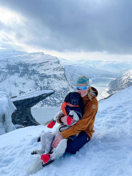 Trolltunga kış gezisinde fotoğraf çekilen bir ziyaretçi ve dostu.