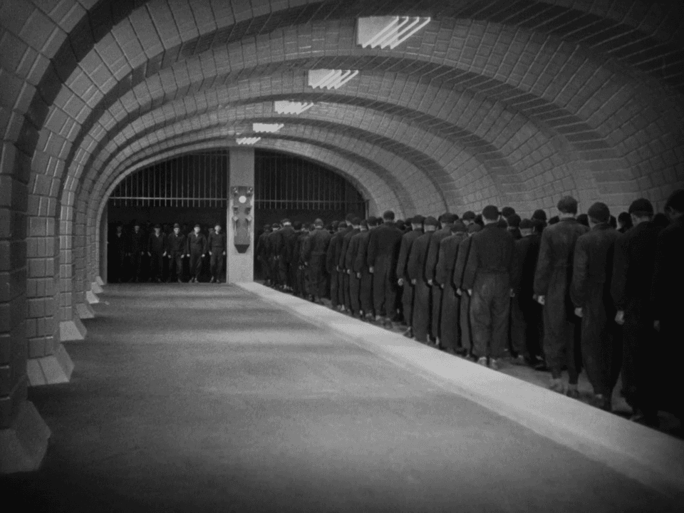 Görsel 5: Mesai değişimi sırasındaki uygun adım yürüyerek mesailerinden çıkan ve mesailerine başlayan işçilerin karşılaşmaları (Lang, 1927).
