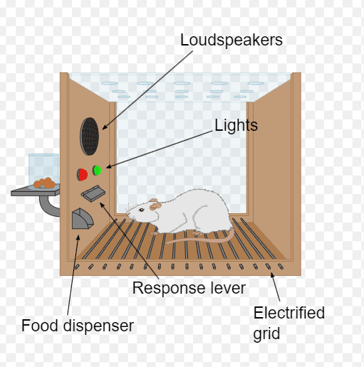 In this research, Skinner aimed to examine operant and classical conditioning by using an animal. So let's find out how this box works. Skinner put a rat into the box and there was a lever that dispensed food. When the rat came across with the lever, it activated the lever and got food. While he was doing the experiment, he realized that the rat did this behavior again and again to get a portion of food.