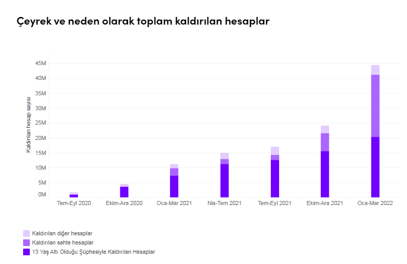 TikTok'un 30 Haziran 2022'de yayınladığı ve 1 Ocak- 31 Mart 2022 tarihlerini kapsayan Şeffaflık Raporu'na göre; topluluk kuralları ya da hizmet kullanım şartlarıı ihlal ettiği gerekçesiyle uygulamaya yüklenen tüm videoların yüzde 1'inden azına karşılık gelen 102,305,516 video küresel çapta kaldırıldı. 13 yaş altı olduğu şüphesiyle kaldırıla video sayısı ise 202,194,76. TikTok, Ocak-Mart 2022 tarihleri arasında küçük yaş güvenliği ile ilgili yüzde 41,7, yasadışı faaliyetler ve ayarlı ürünler ile ilgili yüzde 21,8, yetişkinlerde çıplaklık ve cinsel aktivite ile ilgili yüzde 11,3, şiddet içeren grafik içeriği ile ilgili olarak yüzde 9,6 videonun kaldırıldığını aktarıyor.