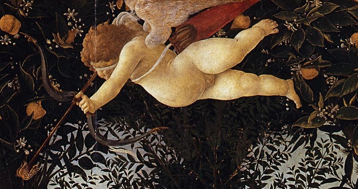 Venüs’ün üzerinde uçan Eros, bir elinde yayı ve diğer elinde oku ile dikkat çeker. Gözü bağlı olan Eros, aşkın rastlantısal doğasını vurgular. Oku, dans eden Üç Güzellerden birine doğru yönelmiştir.
