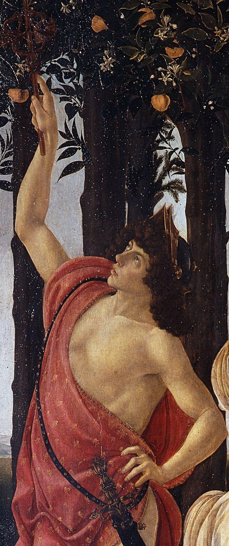 Sol tarafta yer alan Merkür, bahçeyi koruyan ve bulutları uzaklaştıran tanrıdır. Elindeki kerykeion (asa), bilgeliği ve barışı temsil eder. Merkür’ün yukarı doğru uzanan hareketi, zihinsel yükselişi ve insan aklının doğaya üstünlük sağlama çabasını simgeler.